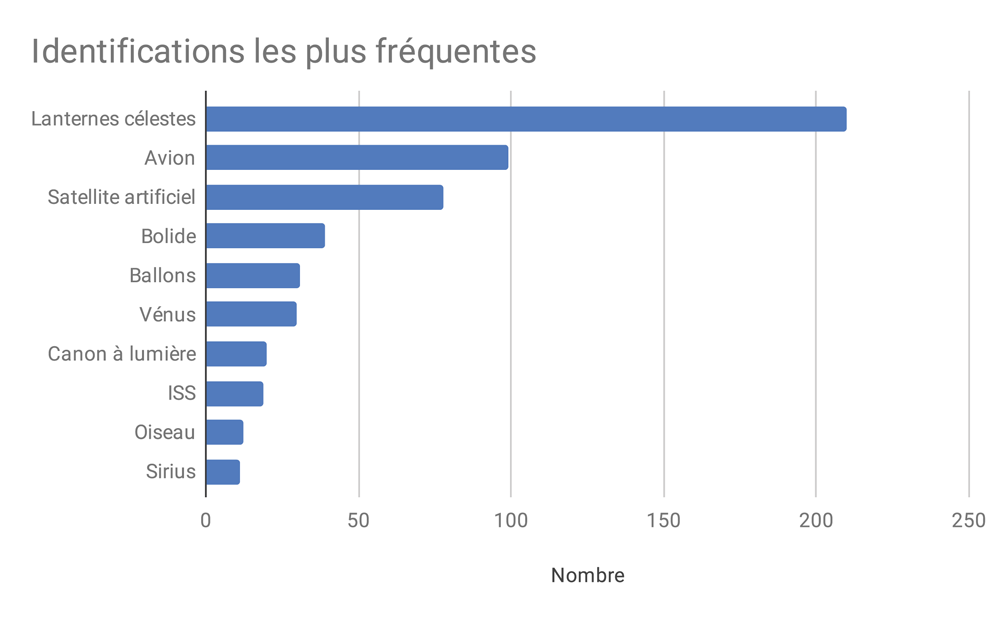 Les identifications les plus fréquentes depuis 2010 sont très largement les lanternes célestes (Figure 7). Mais depuis 2016, la confusion avec des lanternes diminue, ce qui montre que le public connaît maintenant mieux ce type d’objet, ne les signale plus autant et que peut-être, également, cette mode est passée. Entre 2019 et 2021, les trains de satellites Starlink et leurs fusées de lancement ont été des sources de confusions très fréquentes (satellites artificiels). Actuellement, ces confusions continuent à être présentes pour environ 5 cas/ans, un peu comme les bolides qui représentent la source de confusion la plus régulière. Les avions semblent être de plus en plus souvent confondus ces dernières années. Ils sont en 2022, comme en 2023, la source la plus fréquente de confusion.